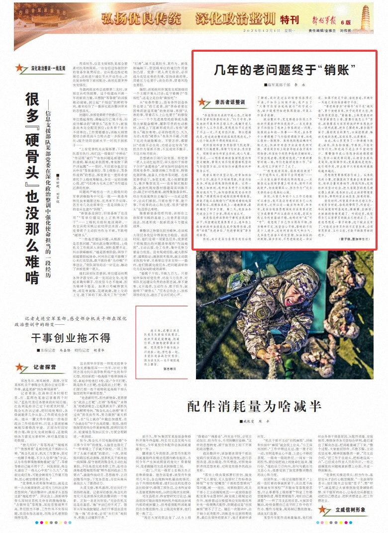 “要把荣誉当‘冲锋号’而不是‘避风港’,勇于突破自我,步子迈得更大些、转型转得更快些。”紧接着,上级党委组织“荣誉面前怎么看,重整行装怎么干”座谈,政委要求大家用好批评和自我批评这一锐利武器,把自己摆进来,拿出抛开面子、揭短亮丑的勇气,以深挖根源、触动灵魂的态度,深刻反思,认真整改。