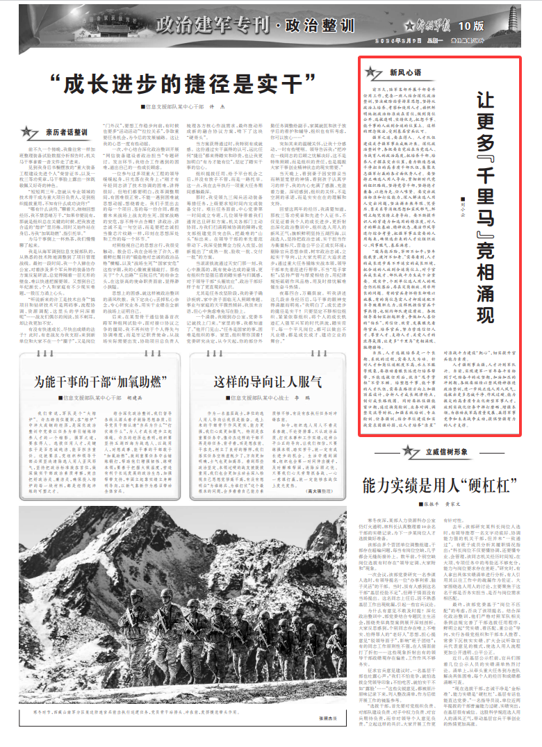 “骏马能历险,犁田不如牛;坚车能载重,渡河不如舟。”需要看到,人才的成长进步离不开适宜的成长环境,把合适的人放到合适岗位上,对于官兵成长成才、部队战斗力生成十分重要。现实中,个别单位选人用人的观念仍比较落后,存在定岗粗放、用非所长的问题。有的官兵身怀特长却难以施展,有的岗位急需人才却因适配不当导致履职乏力,这样既挫伤官兵干事热情,也制约部队建设质效。各级领导要切实担起职责,争做知人善任的“伯乐”,用信任、欣赏、发展眼光看待官兵、培养官兵,努力营造信任人才、尊重人才、支持人才、关爱人才的浓厚氛围,让更多“千里马”竞相涌现、驰骋疆场。