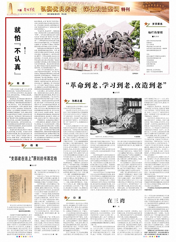 “世界上怕就怕‘认真’二字,共产党就最讲认真。”这是毛泽东同志的名言。世上万事万物,如何对待它,是认真还是马虎,结果大相径庭。干事创业是这样,思想改造也是如此。