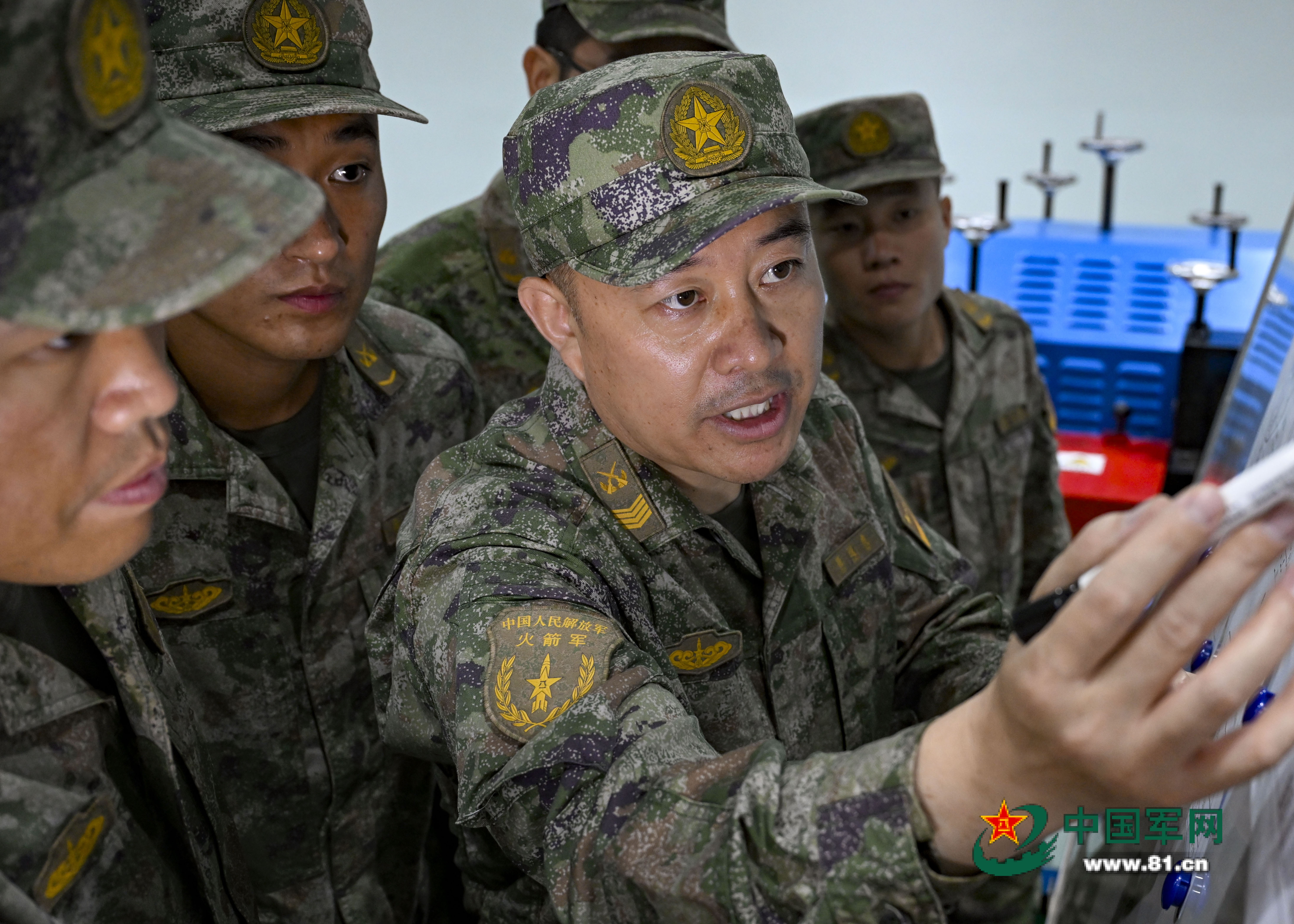 火箭军某旅一级军士长崔道虎(中)在与战友探讨设备改进方案。刘明松摄