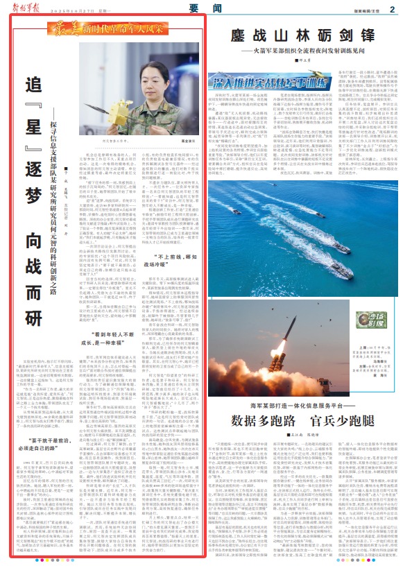 追“星”逐梦,向战而研。系统学习大量资料、走访50多家科研院所……那段时间,何元智经常凌晨4点起床背参数、学操作,连吃饭时心里都想着电路图。深夜的办公室里,何元智对着成堆的文献逐字推敲;野外试验场上,为了验证一个参数,她反复演算直至得到正确答案。有人劝她“不必太拼”,她却说:“我们本就起步晚,只有跑起来才能迎头赶上。”