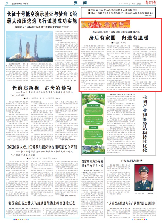 记者拨通新疆军区某团斯姆哈纳边防连中士杜李陈的电话时,他已回到四川巴中老家。他高兴地说:“这是我入伍后第一次回家过年,连队提前半个月通知购票,旅途中的军地各项保障细致周到,这份温暖让我戍守边关、守护家国的信念更加坚定!”