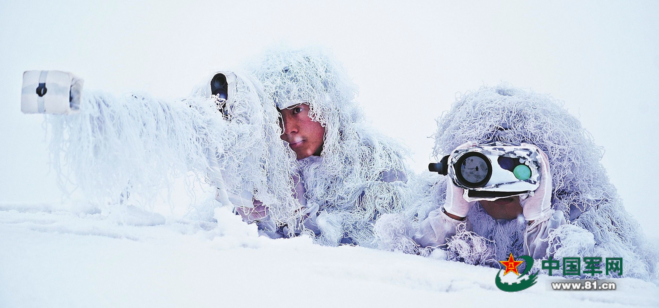 大地白茫茫一片,四周静得能听见呼吸的声音……在雪岭上趴伏许久,狙击手唐鹿和观察手张宏阳仿佛已与身下的冻土融为一体,但依然目光警惕地注视着前方。