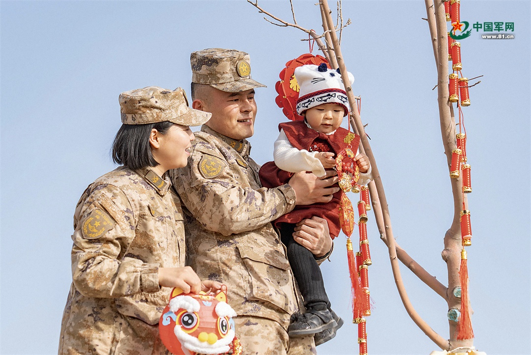 图为一对年轻的军士夫妇抱着小军娃把新春愿望挂上“许愿树”。庹健聪 摄