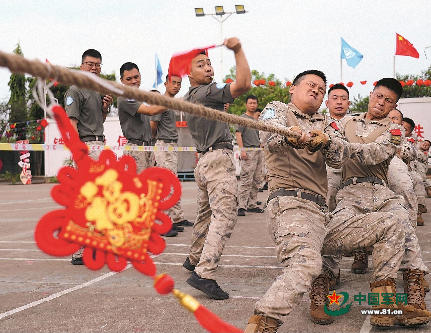 中国第12批赴南苏丹(朱巴)维和步兵营官兵,在春节期间开展多种活动丰富节日生活。图为官兵举行拔河比赛。周飞 摄