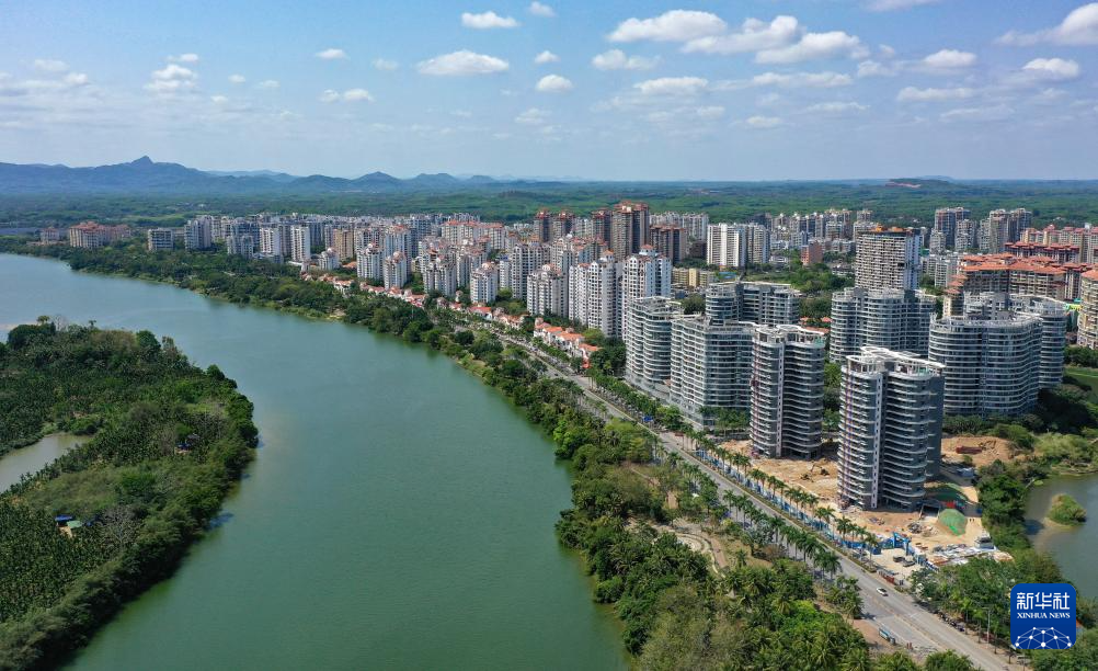 3月19日拍摄的万泉河畔的琼海市区景色(无人机照片)。