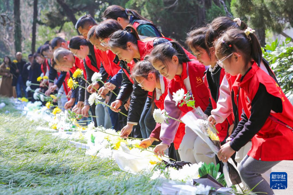 4月2日,在江苏省海安市烈士陵园,志愿者向烈士敬献鲜花。