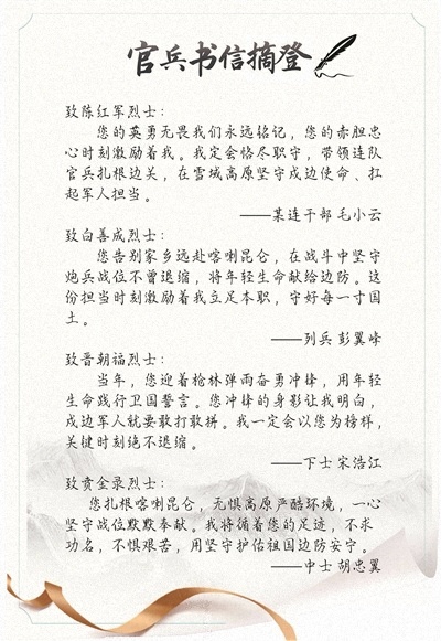 一封封书信,饱含对英烈舍身报国的敬仰,也立下了新时代革命军人的铮铮誓言。3年来,连队官兵累计给英烈写信300余封。这些书信已成为官兵赓续英烈精神、筑牢守边信念的生动写照。