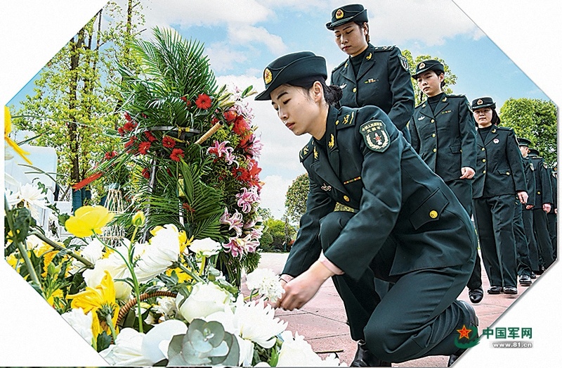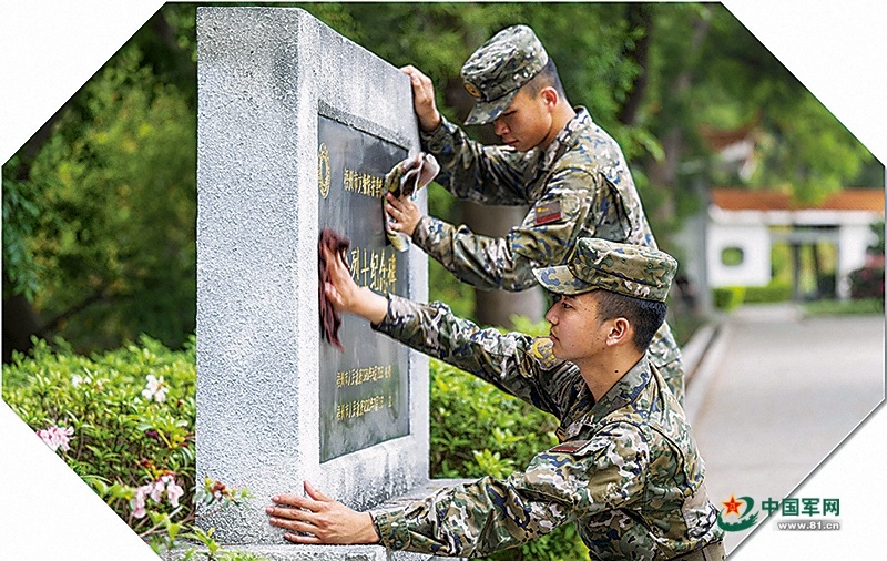 某部官兵在清明祭扫活动中擦拭烈士纪念碑。朱辉煌 摄