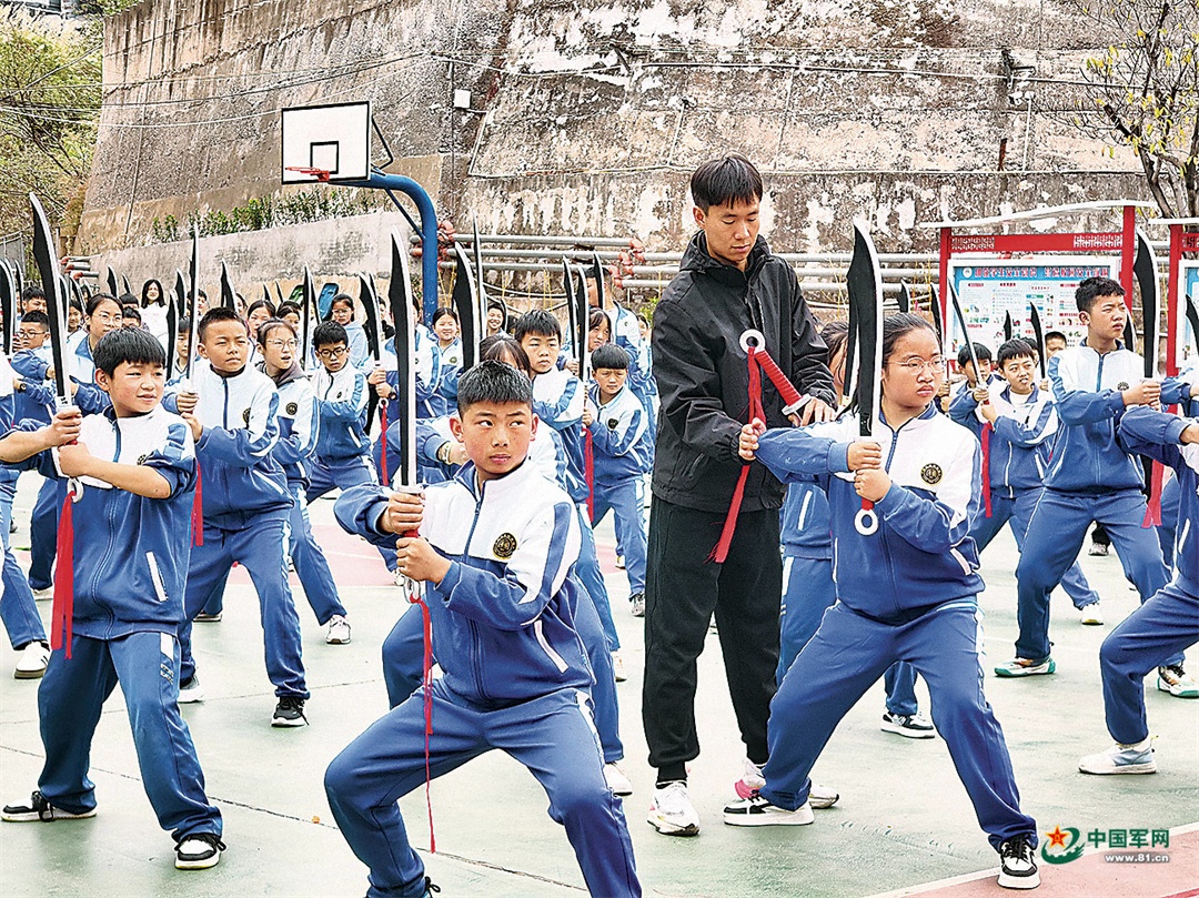 3月23日上午,云南省彝良县题铭学校课间活动时间,百余名少年的铿锵誓言响彻校园。他们手持木刀,列阵肃立。在教练员口令指引下,整齐演练源自长城抗战烽火的经典刀法——“破锋八刀”。