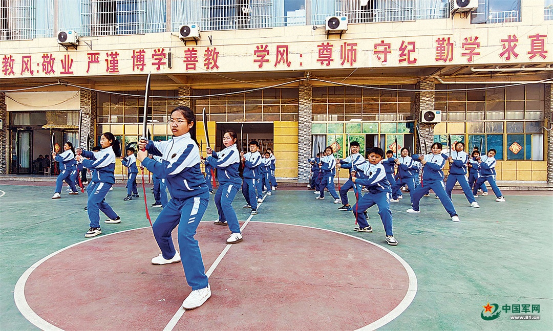 题铭学校学生在操场上练习“破锋八刀”。