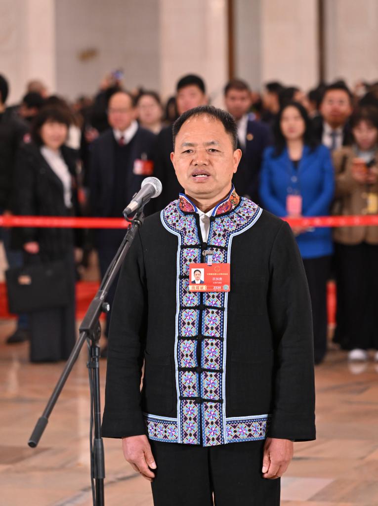3月5日,第十四届全国人民代表大会第四次会议首场“代表通道”集中采访活动在北京人民大会堂举行。这是全国人大代表农加贵接受媒体采访。