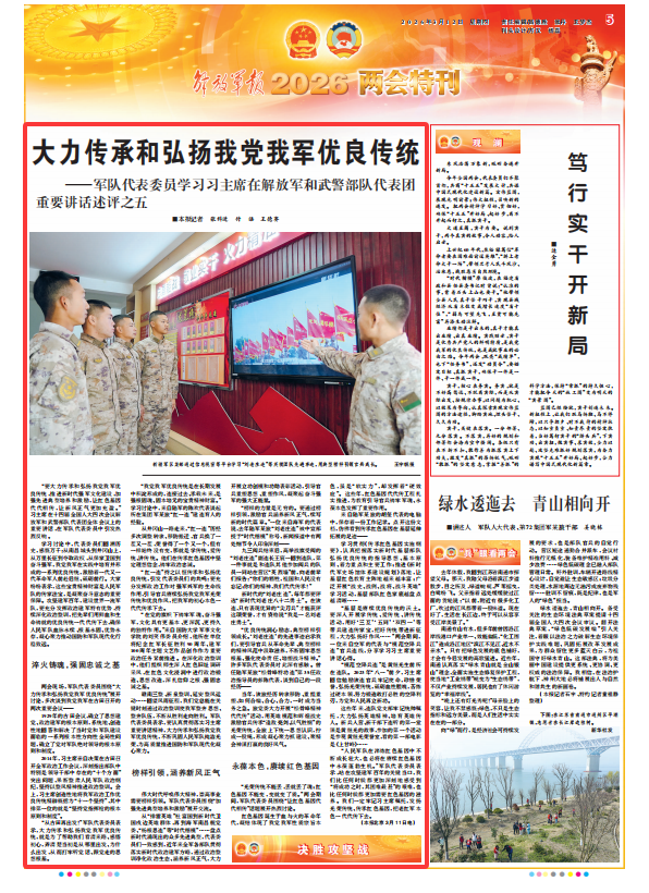 “要大力传承和弘扬我党我军优良传统,推进新时代强军文化建设,加强先进典型培养和激励,让红色基因代代相传,让新风正气更加充盈。”习主席在十四届全国人大四次会议解放军和武警部队代表团全体会议上的重要讲话,在军队代表委员中引发热烈反响。