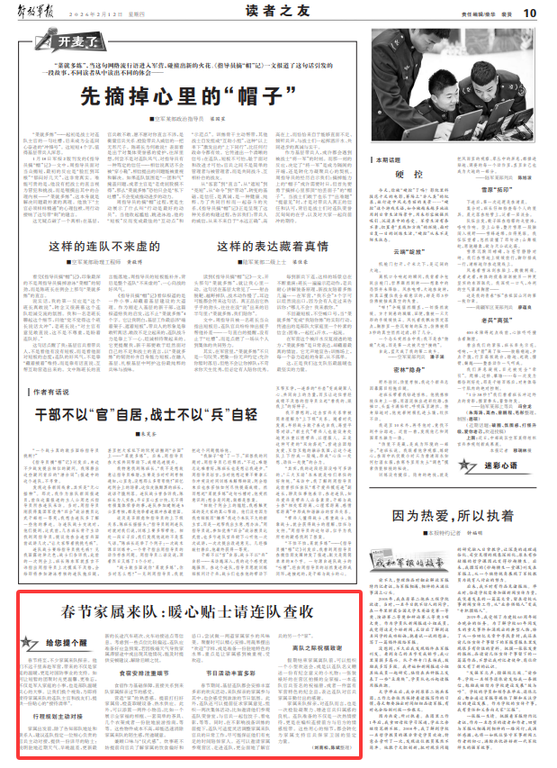 春节期间,基层连队都会安排丰富多彩的欢庆活动,来队探亲的家属参与其中,也会感受到浓浓的节日氛围。此外,连队还可以提前征求家属意见,组织一两次集体活动,比如邀请他们参观连队荣誉室,与官兵一起包饺子、看电影,等等。同时,在不影响战备训练的前提下,连队可适度灵活调整家属来队官兵的日常工作,尽可能保证他们有充足的时间陪伴家人。还可以邀请家属参观营区、走进连队,更全面地了解官兵的另一个“家”。