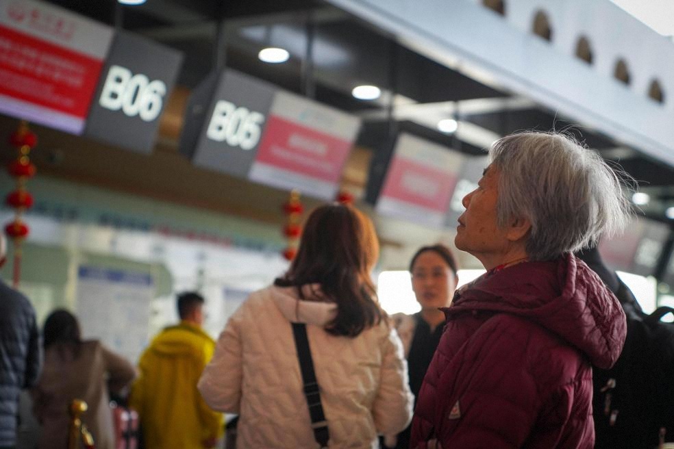 2月12日,在长春火车站“春之约”爱心服务站,工作人员马丛(左)叮嘱年过七旬的吴世豪(中)、徐茂运夫妇换乘注意事项。徐茂运和吴世豪老两口从山东老家去吉林蛟河看望女儿,在长春换乘,女儿提前预约了“春之约”爱心服务班组,帮助引导他们换乘列车。