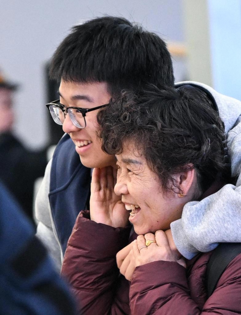 2月14日,在湖北武昌站,王女士(右一)与家人相会,一家人的开心写在脸上。