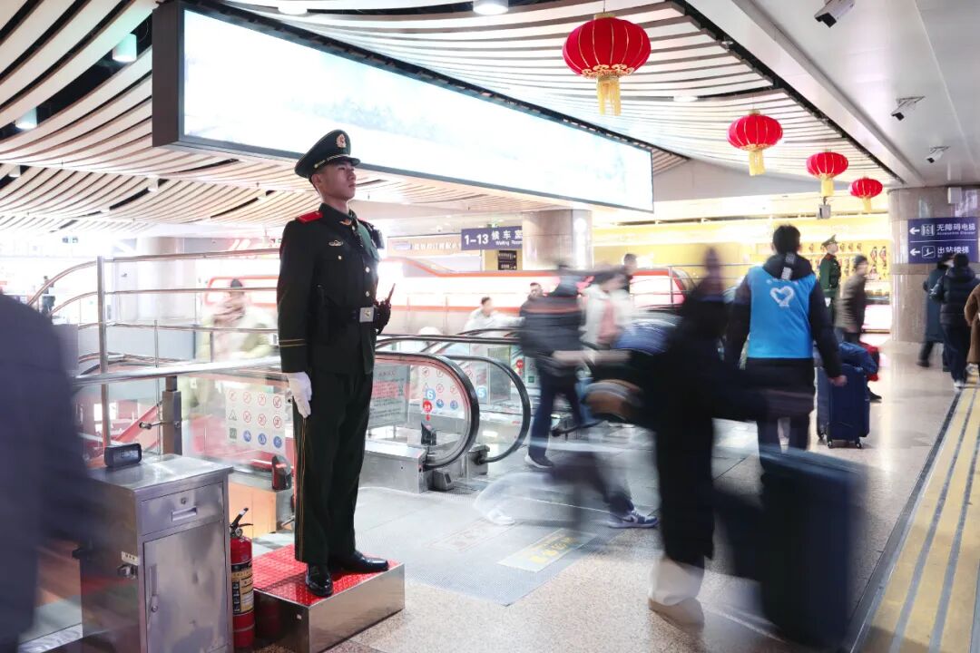 执勤官兵按照“定人、定岗、定时、定责”的要求,在车站各重点部位实施全天候值守。他们在人流量密集的进站口、安检区、候车大厅等关键点位加强巡逻管控,协助维持现场秩序,同时密切观察客流动态,及时发现并排除安全隐患,为春运旅客筑牢安全出行屏障。