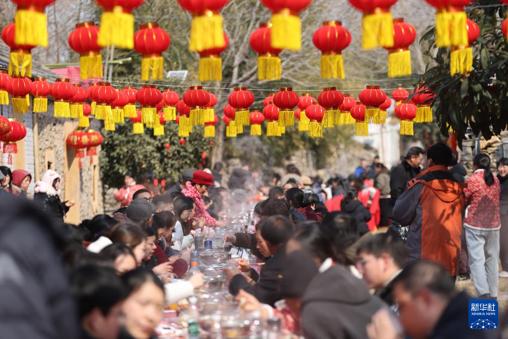 2月7日,游客在江苏省淮安市洪泽区老子山镇龟山村举行的“渔火传千年 石屋启新岁”迎新春活动中,品尝长桌宴上的美食。