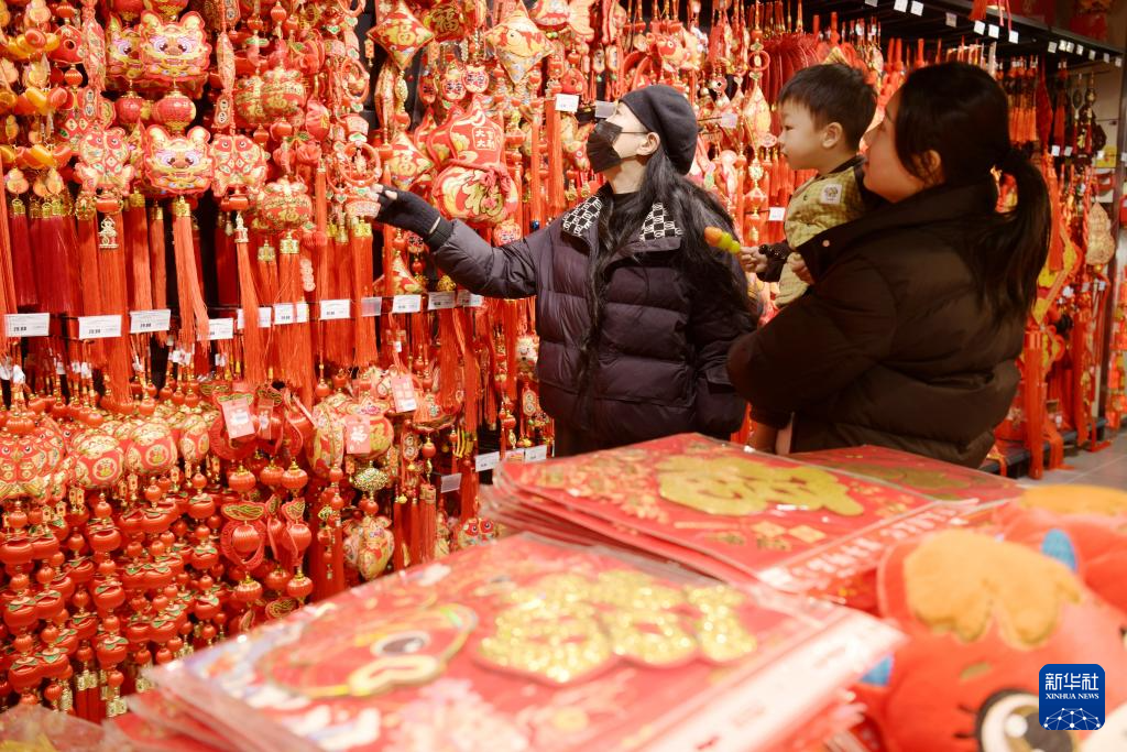 2月7日,在河南省商丘市夏邑县龙湖天街一家饰品商店,市民在选购春节饰品。