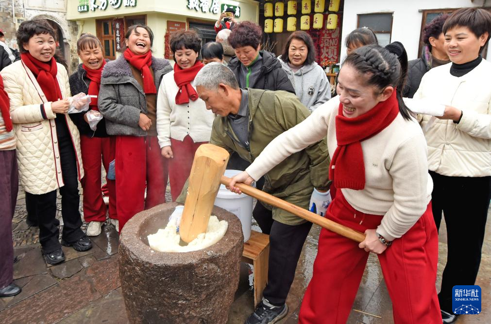 2月6日,浙江省台州市仙居县埠头镇西亚村古村落,游客体验捣麻糍。