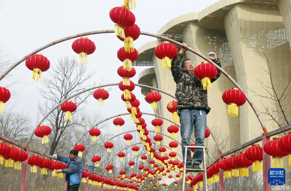 2月7日,在河南省洛阳市汝阳恐龙国家地质公园,工作人员在挂灯笼。