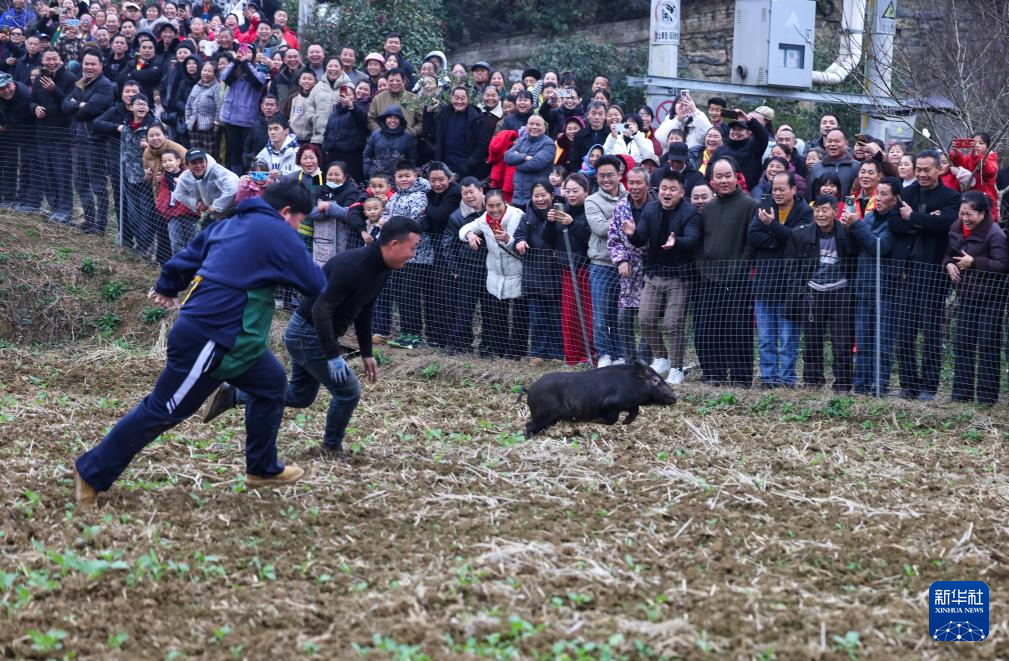 2月7日,在贵州省铜仁市玉屏侗族自治县皂角坪街道瓮阳村,村民进行抓猪比赛。