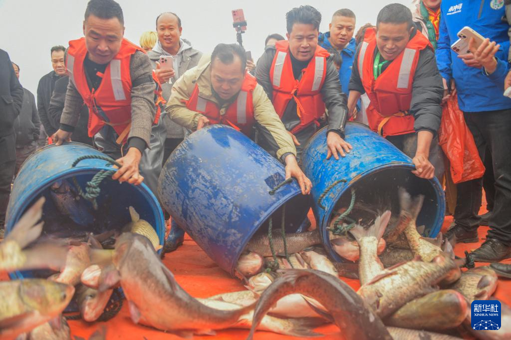2月7日,在湖南省永州市道县白马渡镇青口村,村民在收获年鱼。