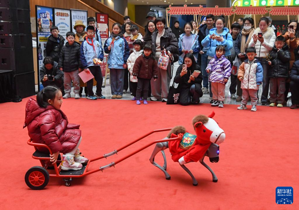 2月7日,在浙江省金华科技馆,机器马和小朋友互动。
