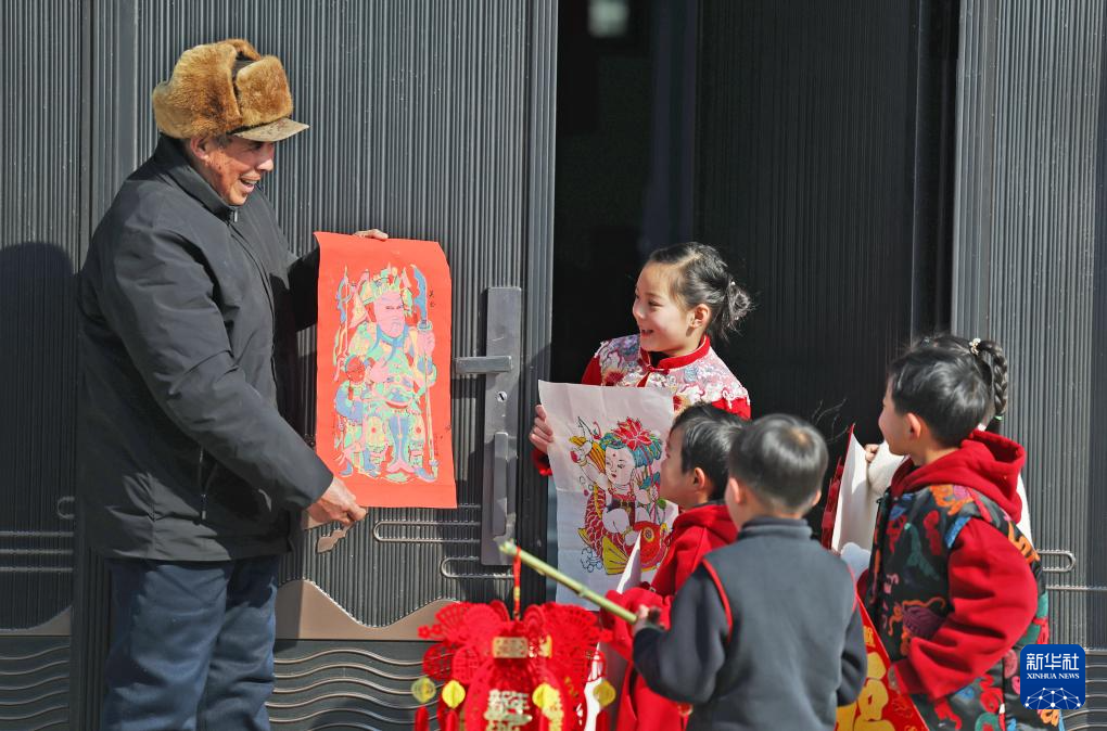 2月7日,在山东省临沂市郯城县郯城街道,一位老人在为孩子们讲解木板年画的传统习俗。