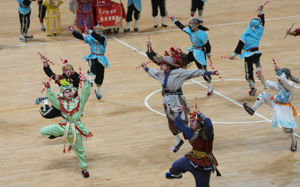 2月28日,来自广东潮汕地区的英歌舞表演队在江南体育馆表演。