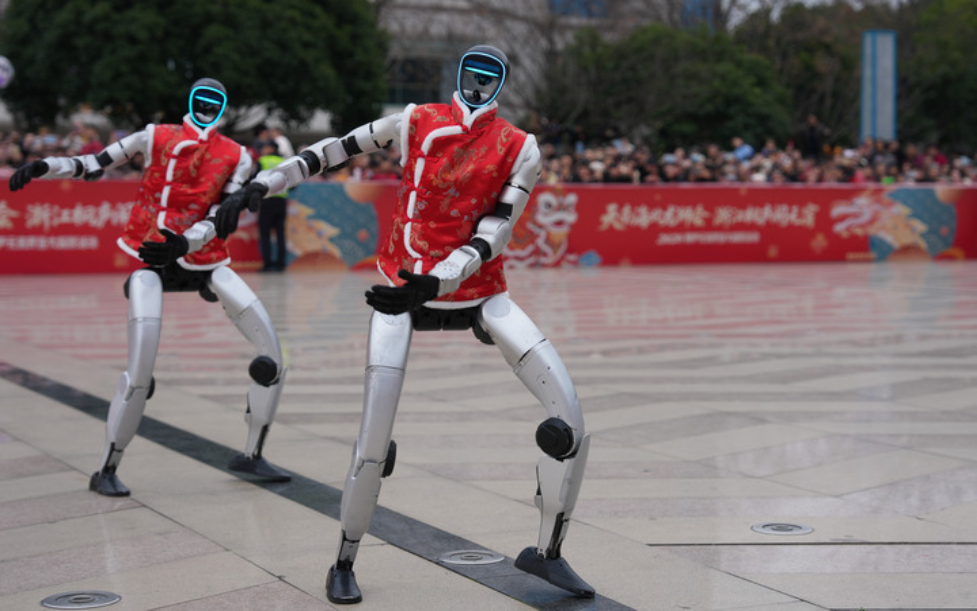 2月28日,宇树科技人形机器人在桐庐县中心广场表演舞蹈。
