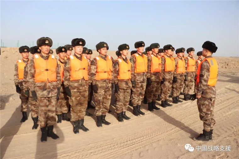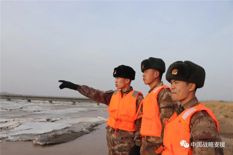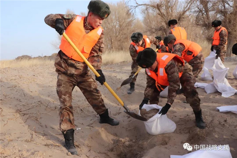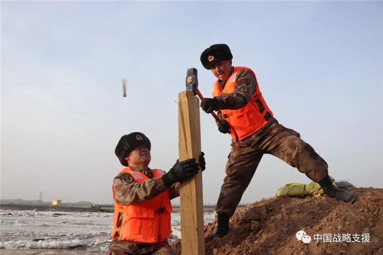虽已立春,但戈壁滩的河水依旧冰冷刺骨,在场官兵毫无畏惧,全力抗击冰洪,用稚嫩的肩膀扛出了一座座生命河堤。河堤两旁飞奔的身影、夯实木桩的整齐口号,展现着人民子弟兵为人民的优良传统。