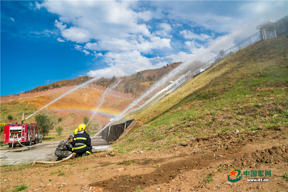 消防应急分队用高压水枪湿润油罐地罐护坡。李志勇 摄