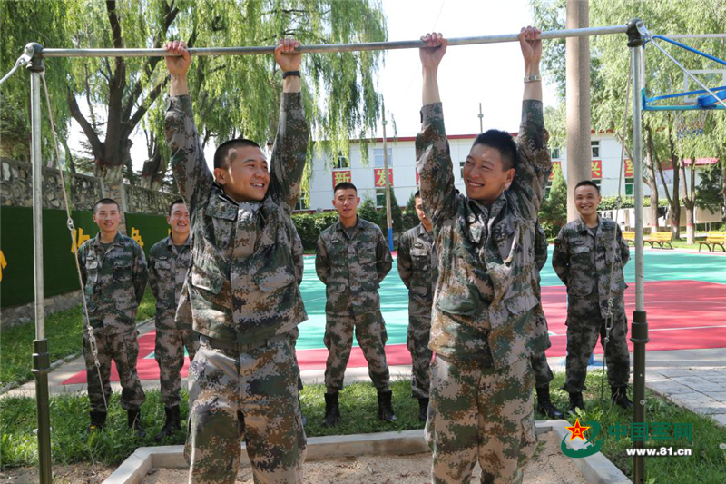 连长陈玉龙跟战士比拼军事科目