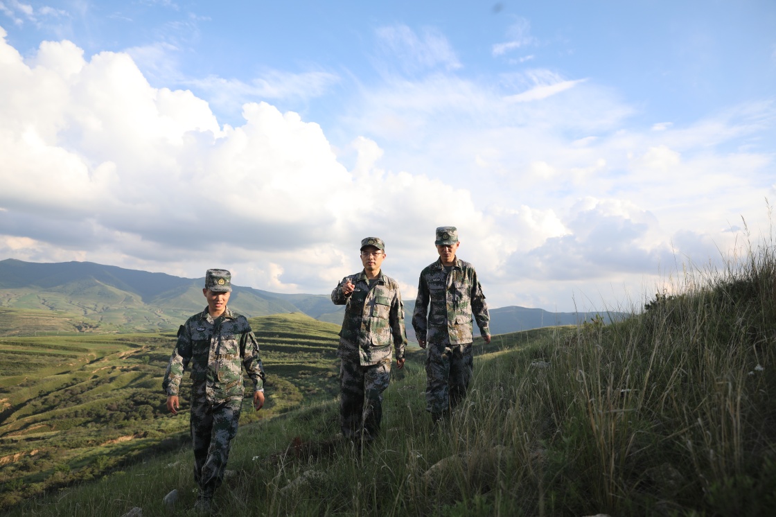 战略支援部队某部高级工程师淳静(中)对训练场筹建情况进行勘察(7月18日摄)。新华社发