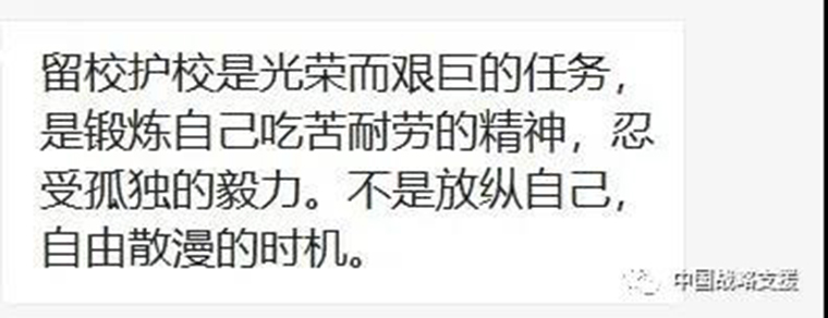 军队院校,“军”字当头,首先是部队,然后才是大学。军校学员,首先是军人,然后才是大学生。党中央有号召,我们就要有行动,而且必须闻令而动,“就地过年”既是落实“疫情就是命令,防控就是责任”的重要指示,更是人民军队勇担重任、敢打硬仗、纪律严明、忠诚使命、令行禁止优良作风的生动体现。