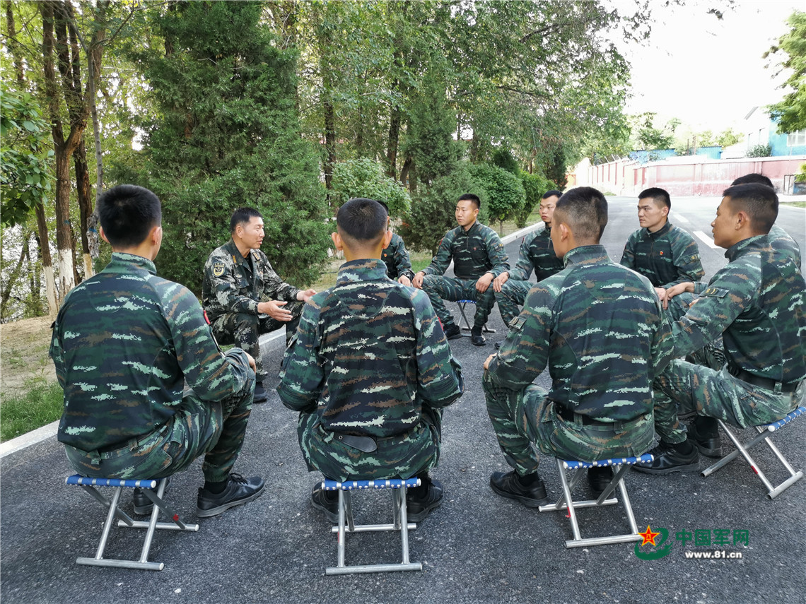 王刚(左二)与战士们交流谈心。牛晨斐 摄