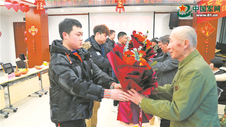 “身体健康,万事如意,虎年大吉!”9名应征青年齐声向老兵致以新春祝福,并献上鲜花。