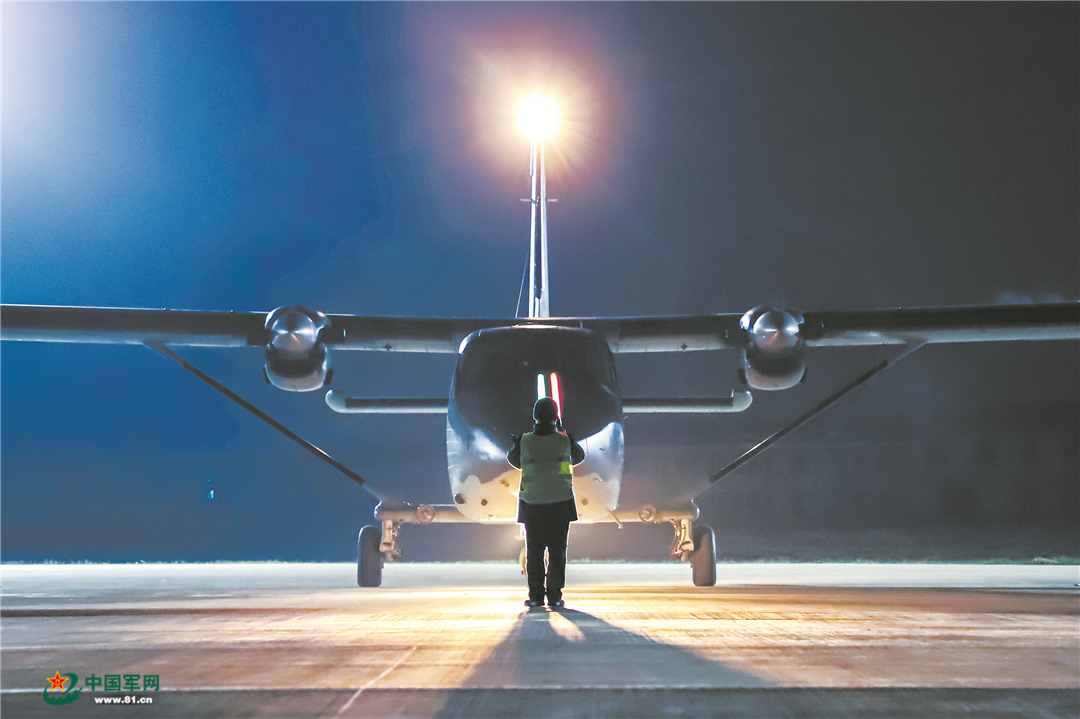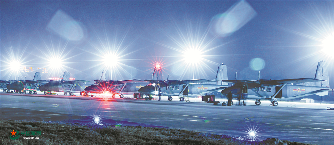 夜幕降临,机场航灯闪烁。随着指挥员一声令下,多架运输机再次接续起飞,在预定空域集结编队。随后,借着茫茫夜色掩护,编队向目标空域隐蔽机动,展开地面目标识别等课目训练……