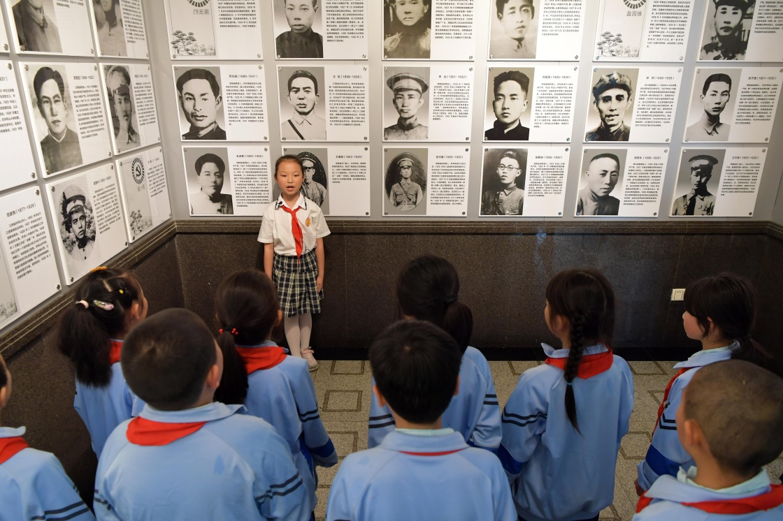 在井冈山革命烈士陵园,“小红军宣讲团”的成员周煜菡给前来参观研学的学生们进行义务讲解(5月12日摄)。新华社记者 彭昭之 摄