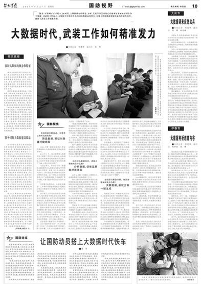 随着“互联网+”正式跨入2.0时代,大数据独有的筛选、分析、关联等智慧功能已经越来越多地被应用在各个领域。对武装工作而言,大数据平台将碎片化的国防数据高度整合,实现了传统数据智能决策的革命性变革,助推了武装工作精准升级。请看今日出版的《解放军报》的报道: