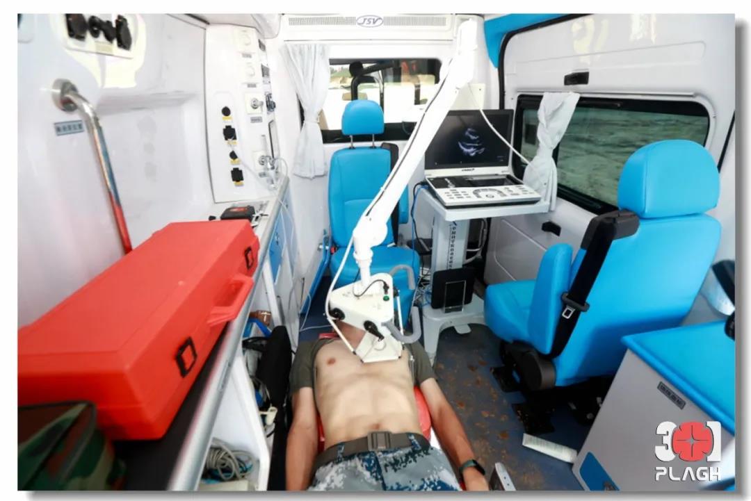 演练中,京外某医疗所受命前接一名胸部受伤、血压下降、可疑核化沾染的战士,转运途中,医疗所远程遥控救护车内的超声机器人,为隔离状态下的伤员实施心脏超声检查,确诊伤员为“创伤性心包积液”,需紧急实施心包穿刺。