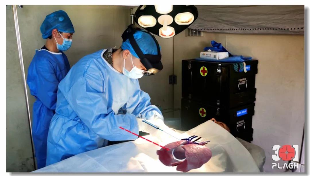 伤员到达后,经洗消检诊确认无核化沾染后,被直接送入医疗所手术车。手术车内医生将VR影像与伤员匹配融合,生成混合现实(MR)影像。远程另一端,第六医学中心心血管病医学部陈韵岱主任佩戴VR眼镜,利用无线网络传输,远程指导手术车内的医生在MR视野下实施双向可视、精致入微的心包穿刺手术,在抽取血性心包积液200ml后,伤员转危为安。