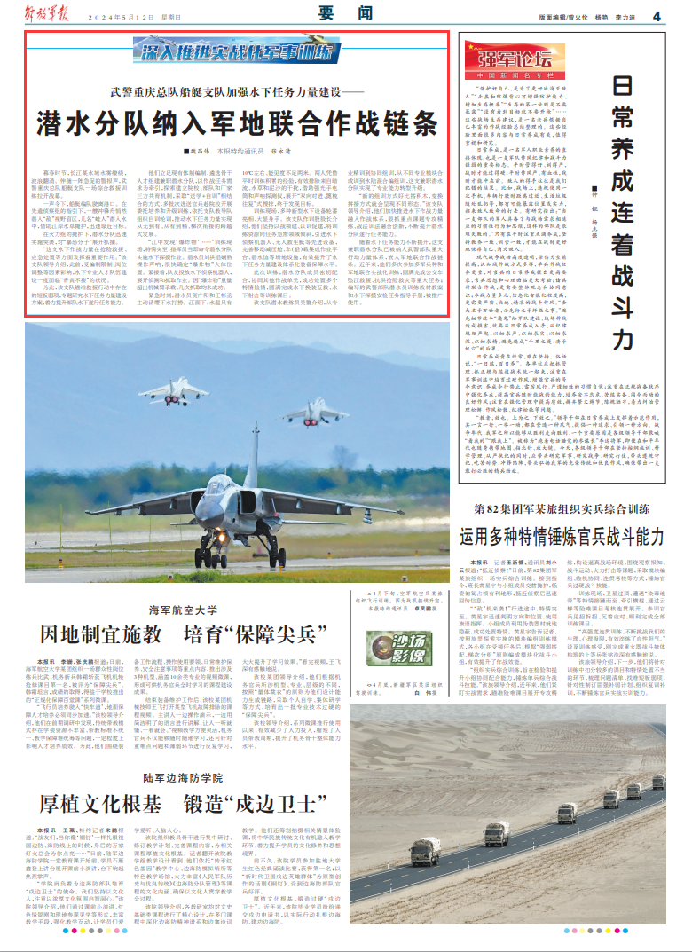 他们立足现有体制编制,遴选骨干人才组建兼职潜水分队,以作战任务需求为牵引,探索建立院校、部队和厂家三方共育机制,采取“送学+自训”相结合的方式,多批次选送官兵赴院校开展委托培养和升级训练,依托支队教导队组织自训轮训,推动水下任务力量实现从无到有、从有到精、梯次衔接的跨越式发展。