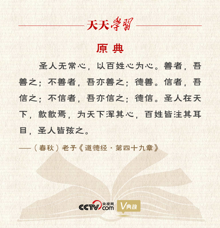 “以百姓心为心”这句古语习近平总书记曾多次引用,对其治国理政思想影响很大。他在十八届中央政治局常委同中外记者见面时所说的“人民对美好生活的向往,就是我们的奋斗目标”以及在十九大报告中4次提到的“以人民为中心”,就是对“以百姓心为心”的当代解读与践行。