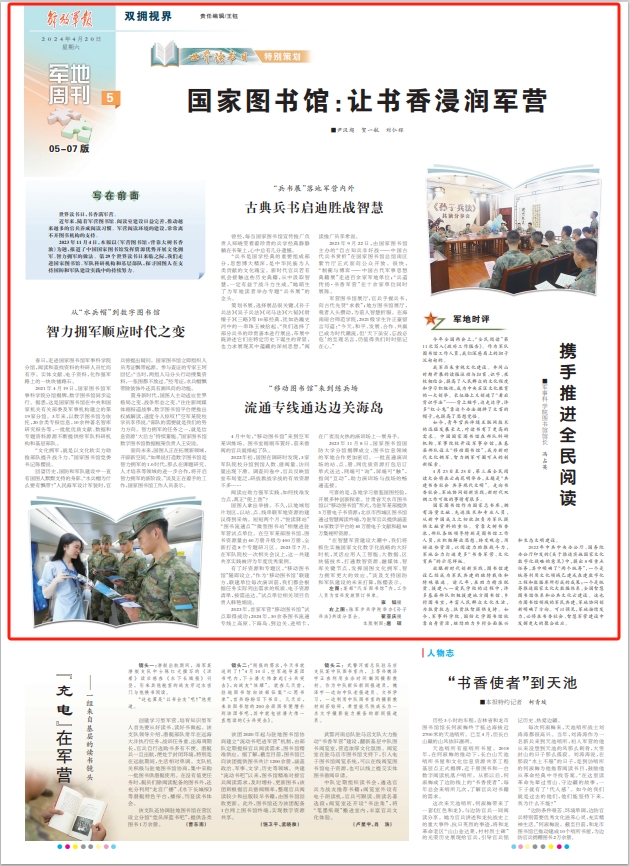 2023年11月4日,本版以《军营图书馆:背靠大树书香浓》为题,报道了中国国家图书馆发挥资源优势开展文化拥军、智力拥军的做法。第29个世界读书日来临之际,我们走进国家图书馆、军队科研机构和基层部队,探寻国图人在支持国防和军队建设实践中的持续努力。