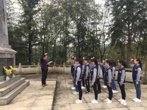 ▲永隆初中组织学生在革命烈士纪念塔缅怀王良烈士。