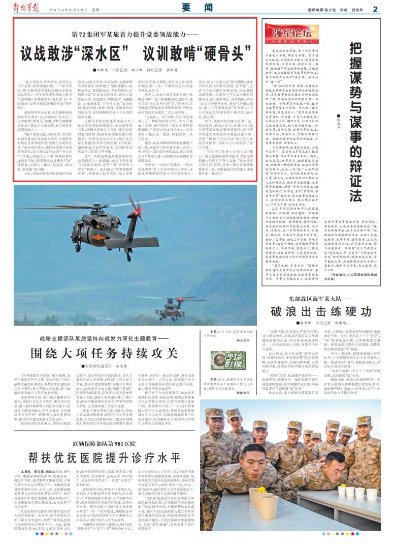 “海上风速大、风向多变,密切关注飞行态势,找准着舰时机……”新年伊始,第72集团军某陆航旅组织党委议战议训会,一名党委常委围绕海上联合作战课题分享最新成果,各机型飞行专家围绕“如何挖掘装备极限性能”展开研讨。