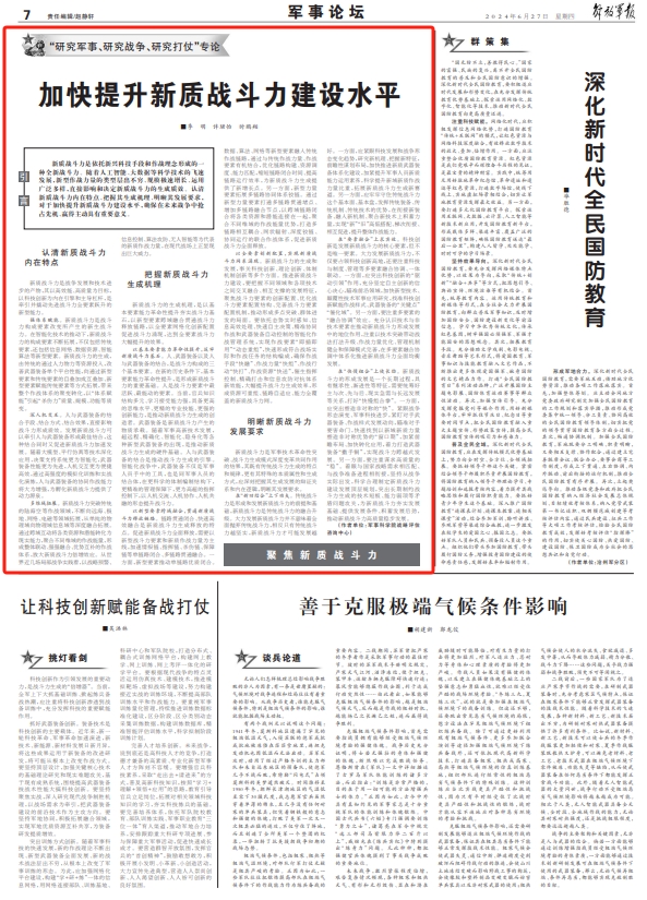 深人机交互。人与武器装备的结合手段、结合方式、结合效果,直接影响战斗力形成质效。发展新质战斗力可以牵引人与武器装备形成最佳结合,这种结合同时又促进新质战斗力加速发展。随着大模型、平行仿真等技术深化应用,决策支持系统更为智能化,武器装备性能更为先进,人机交互更为便捷高效,通过高强度的模拟化训练和实战化演练,人与武器装备的协同作战能力将大为增强,为孵化新质战斗力提供了动力源泉。