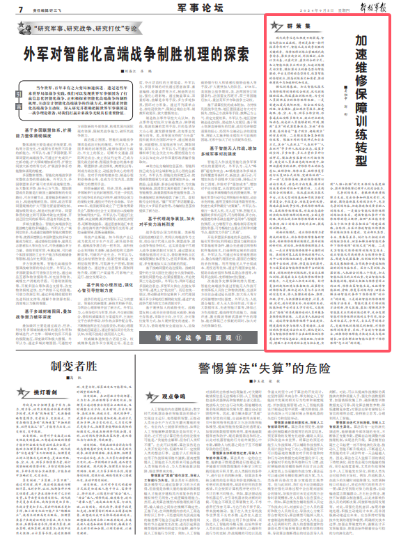 现代战争信息化程度不断提高,智能化特征日益显现。特别是在新一轮科技革命作用下,智能已成为战争制胜的关键因素。维修保障训练应紧贴现代战争需求,聚焦实战实训、科技强训,采取以实为基、以虚代实、虚实结合的方式,加大智能化技术应用比重,加速训练模式由实装、模拟器为主的静态型向智能驱动、平台支撑的动态型转变,依靠智能的倍增效应,提高训练层次和质量,推动新质战斗力加速孵化和生成。